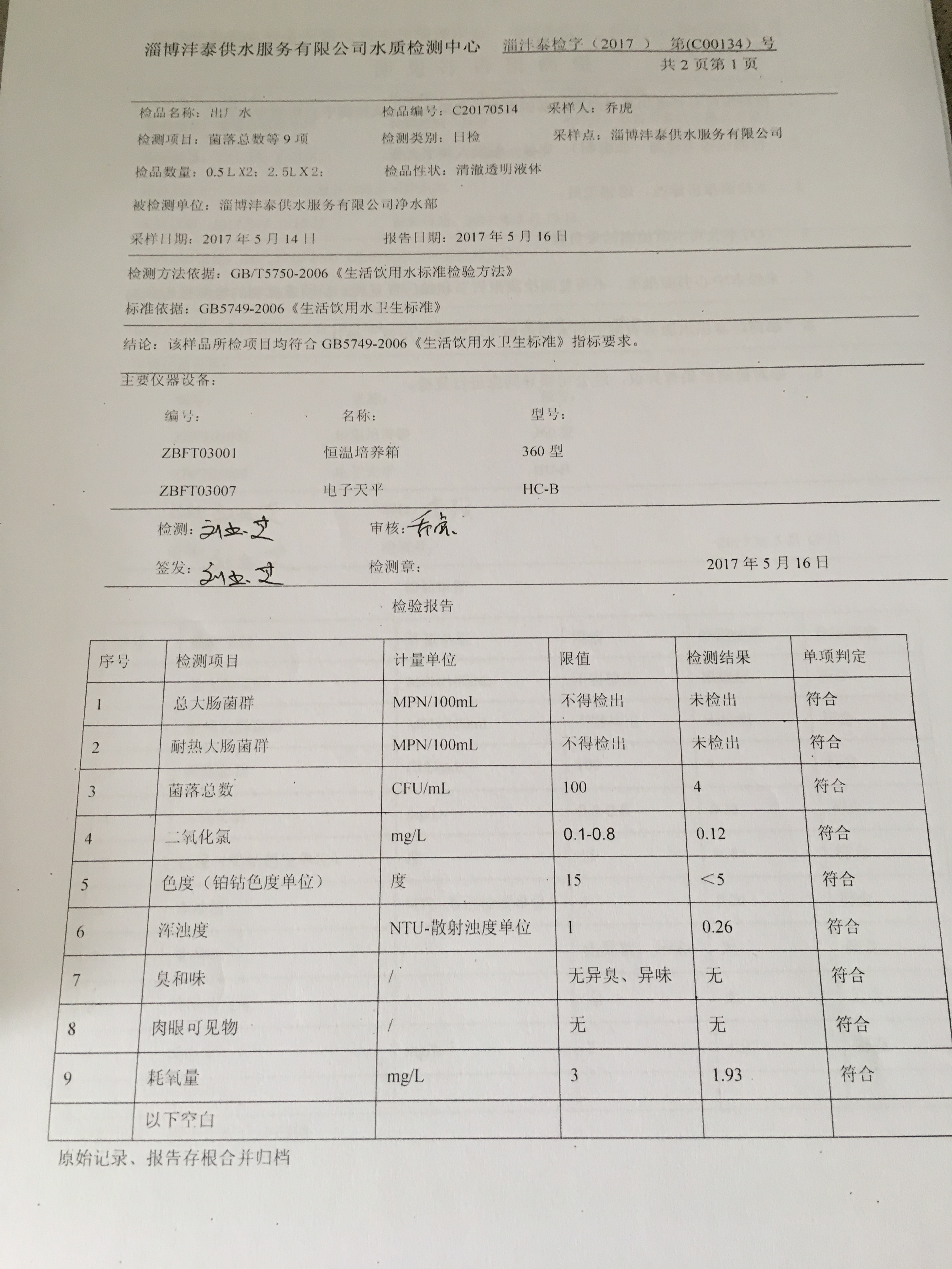 淄博灃泰供水服務(wù)有限公司水質(zhì)檢測(cè)日?qǐng)?bào)表
