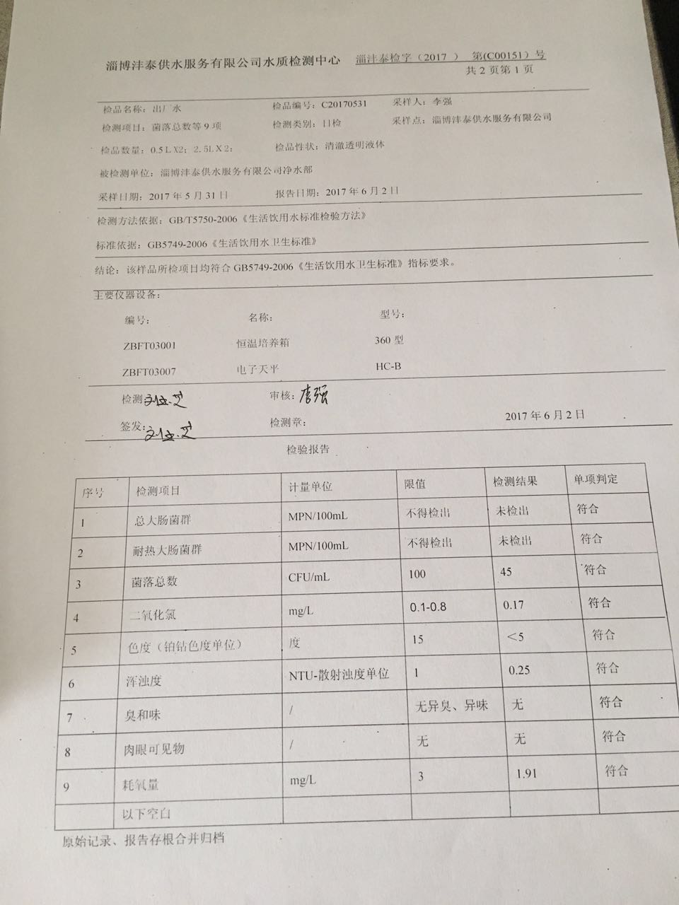 淄博灃泰供水服務(wù)有限公司水質(zhì)檢測日?qǐng)?bào)表