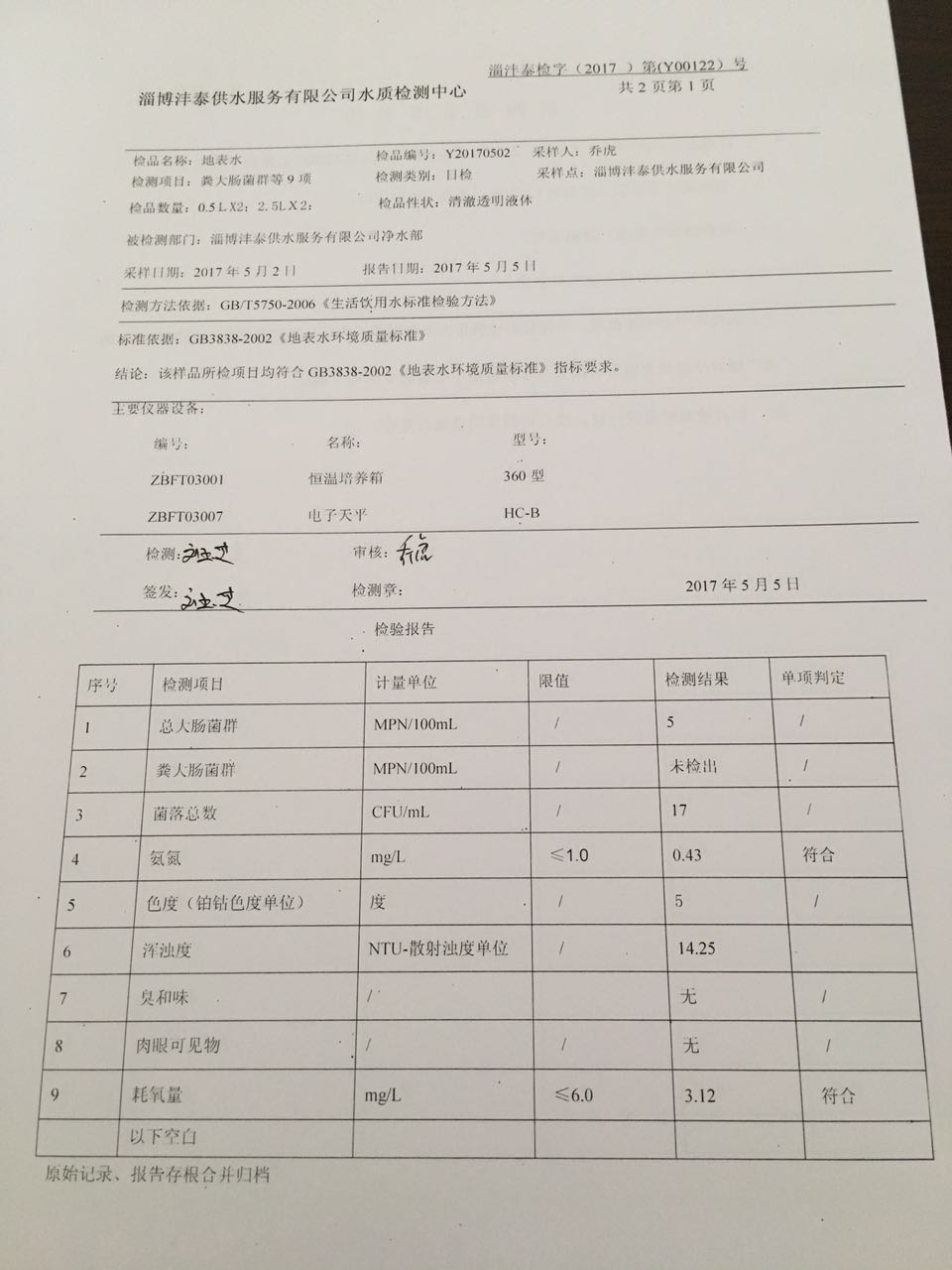 淄博灃泰供水服務(wù)有限公司地表水檢測日報(bào)表