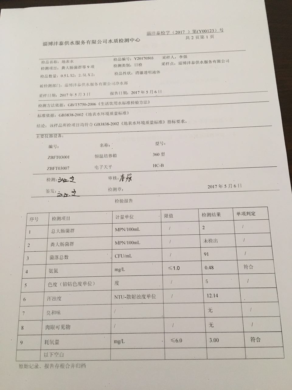 淄博灃泰供水服務(wù)有限公司地表水檢測(cè)日?qǐng)?bào)表