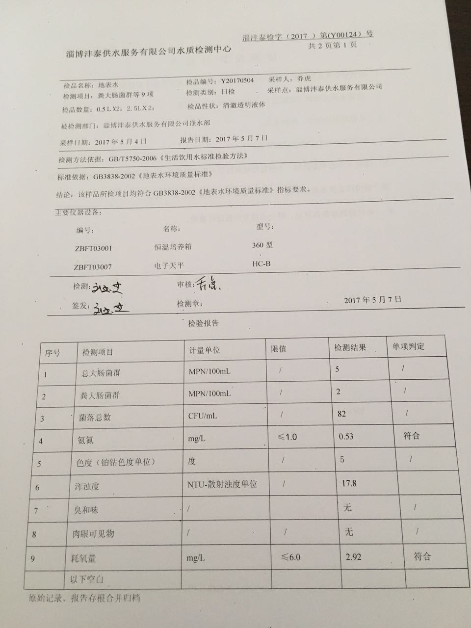淄博灃泰供水服務有限公司地表水檢測日報表
