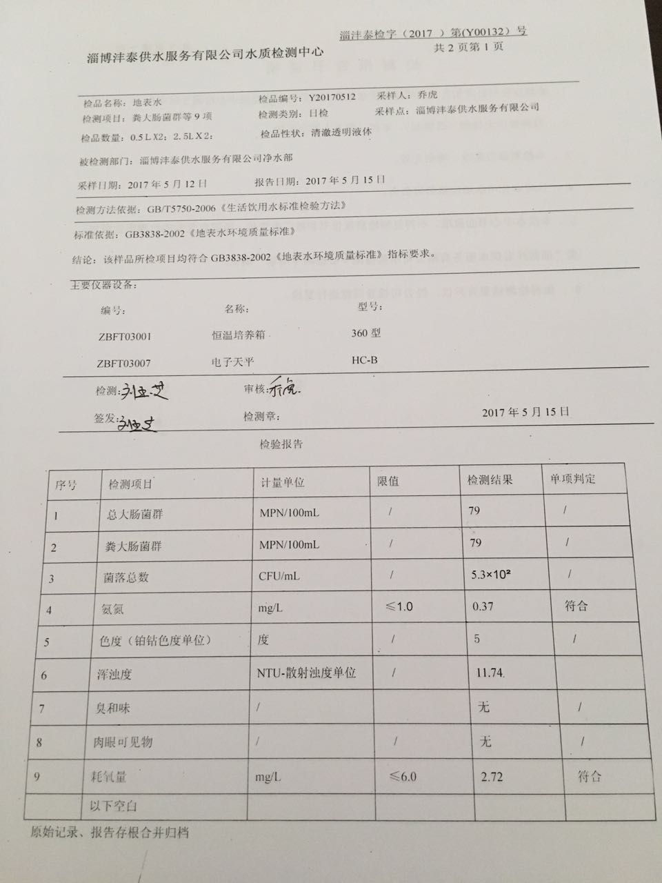 淄博灃泰供水服務(wù)有限公司地表水檢測日報表