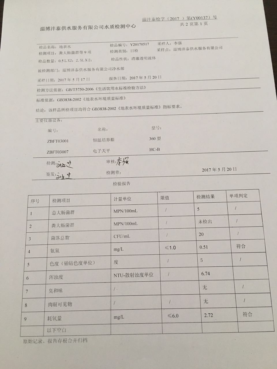 淄博灃泰供水服務(wù)有限公司地表水檢測日報表