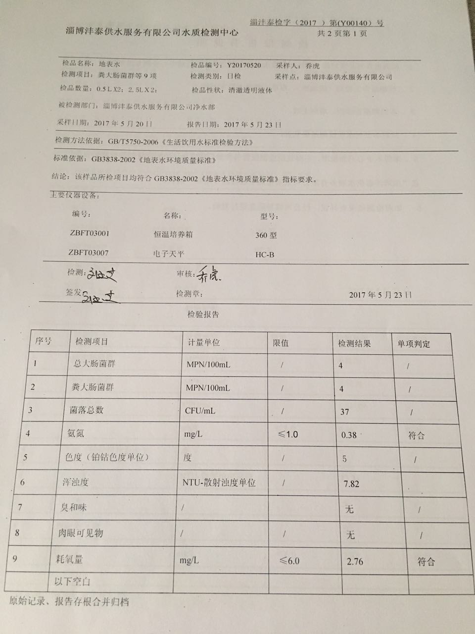 淄博灃泰供水服務(wù)有限公司地表水檢測日報表
