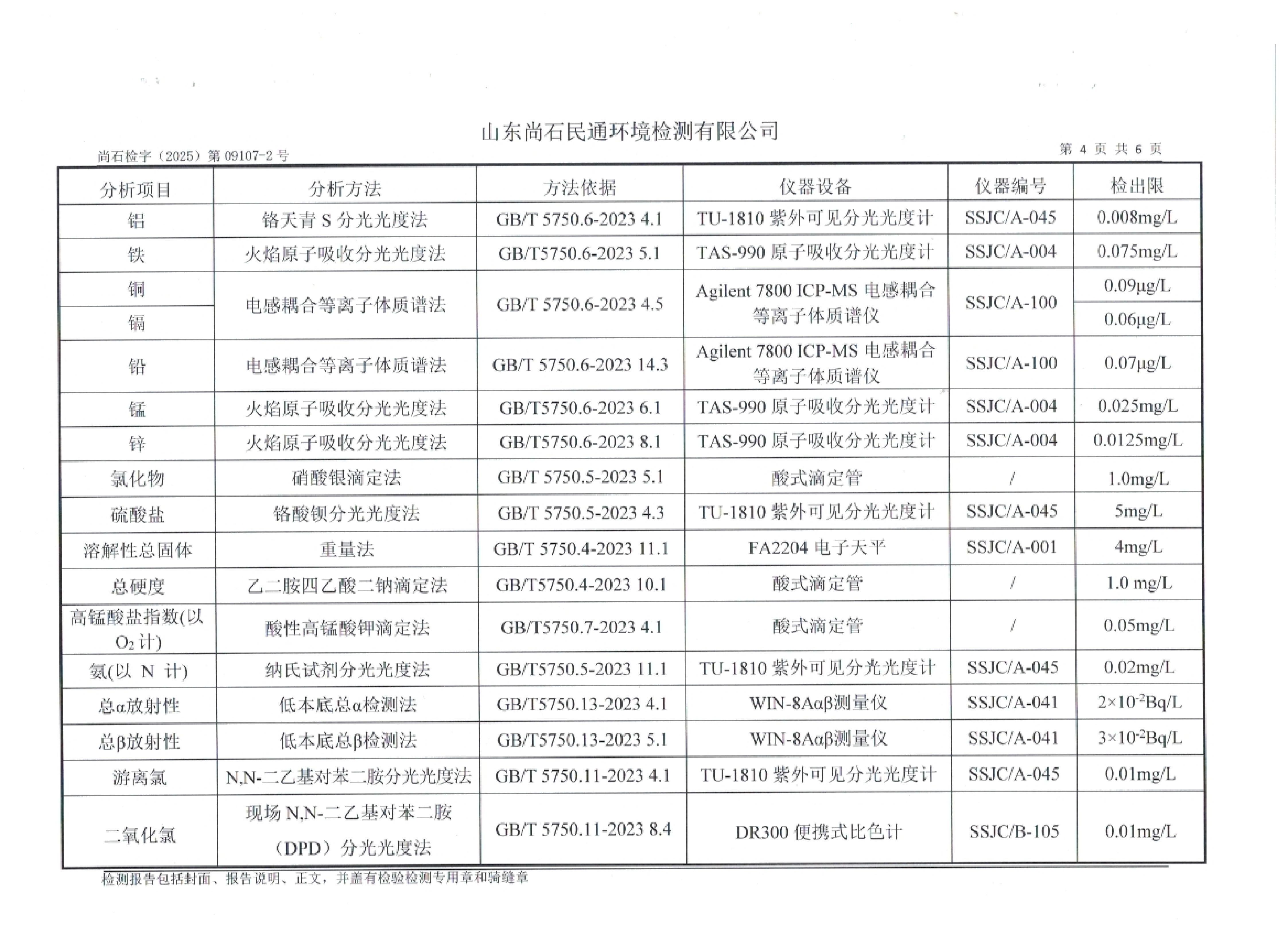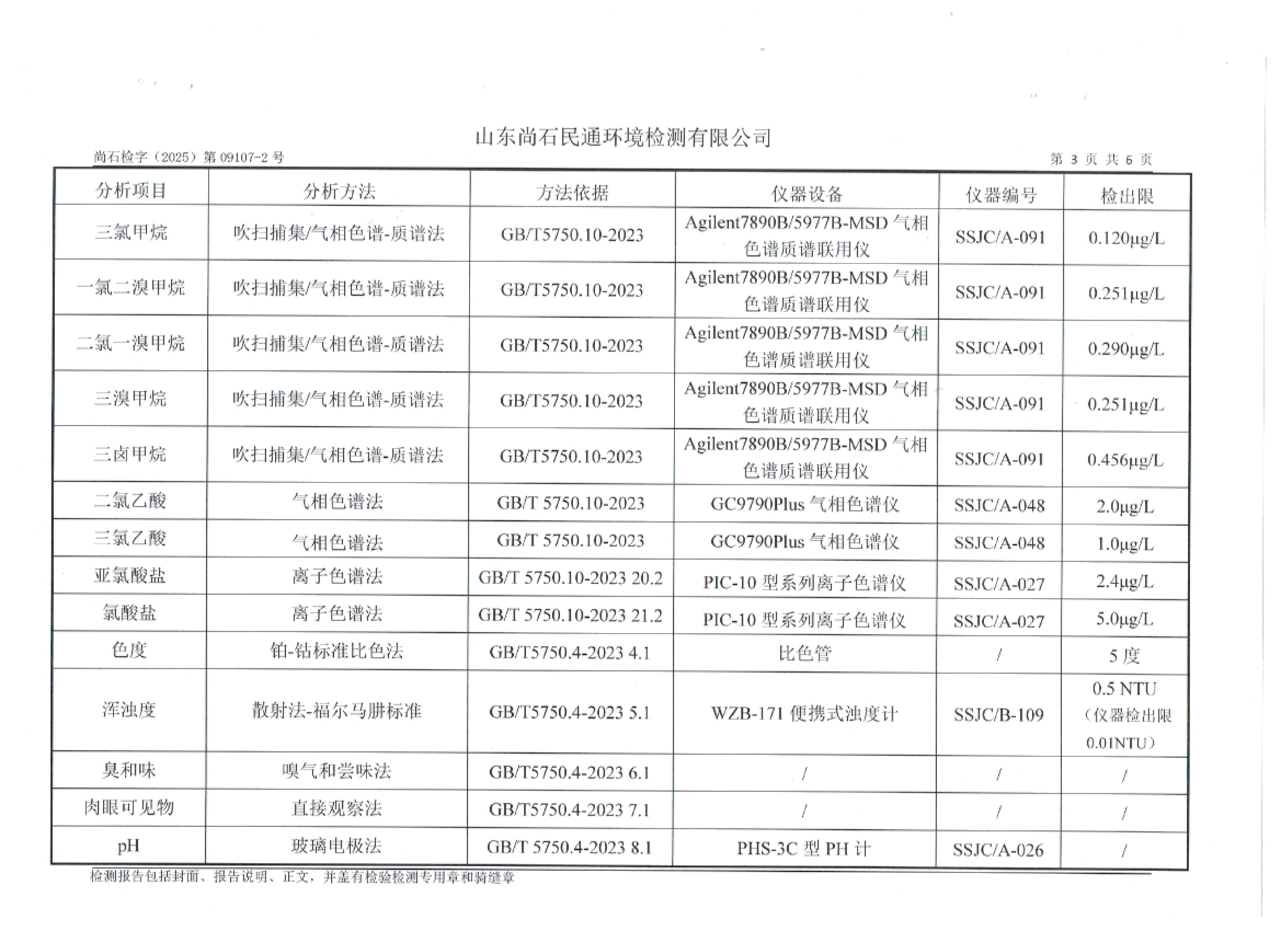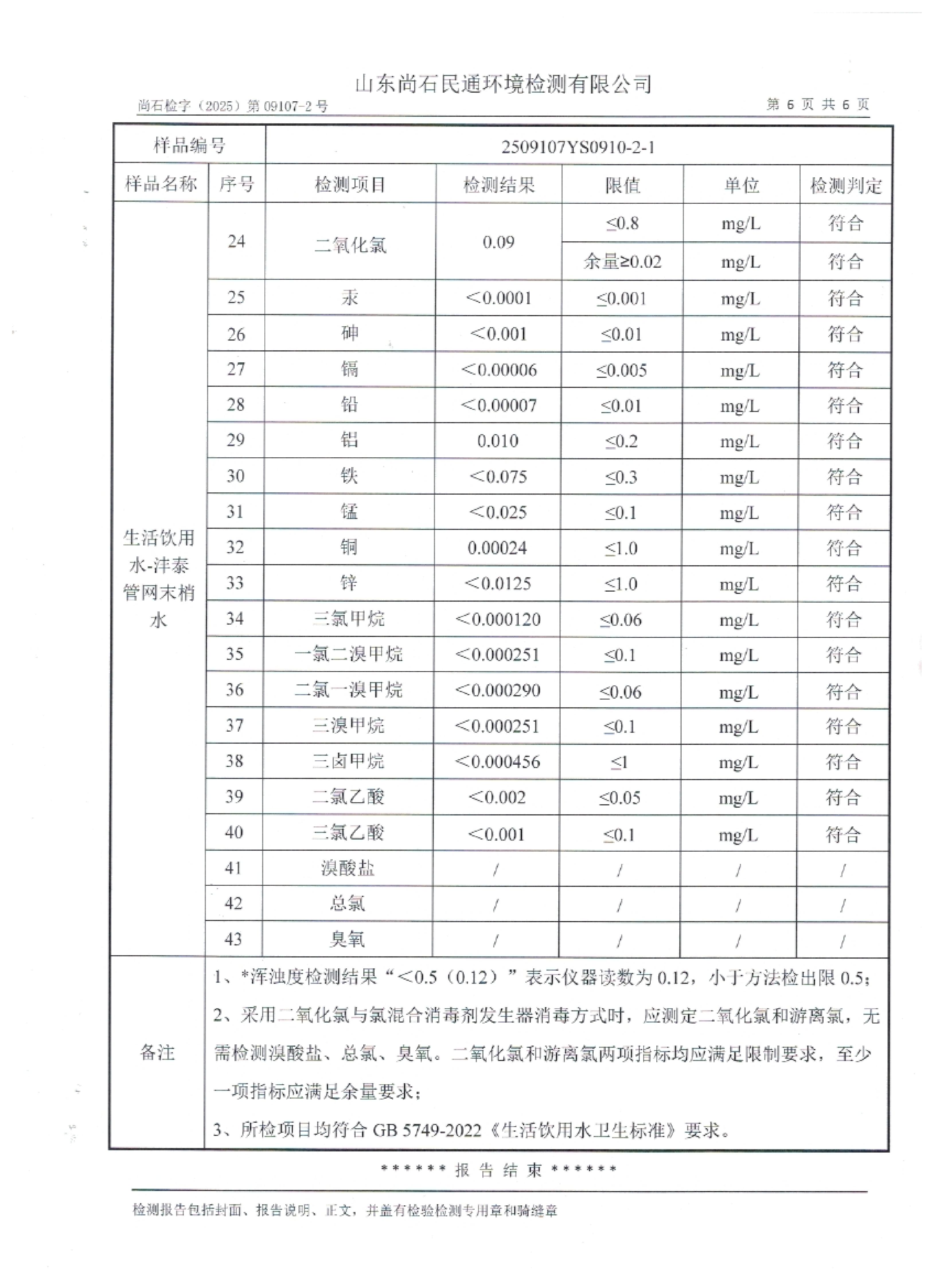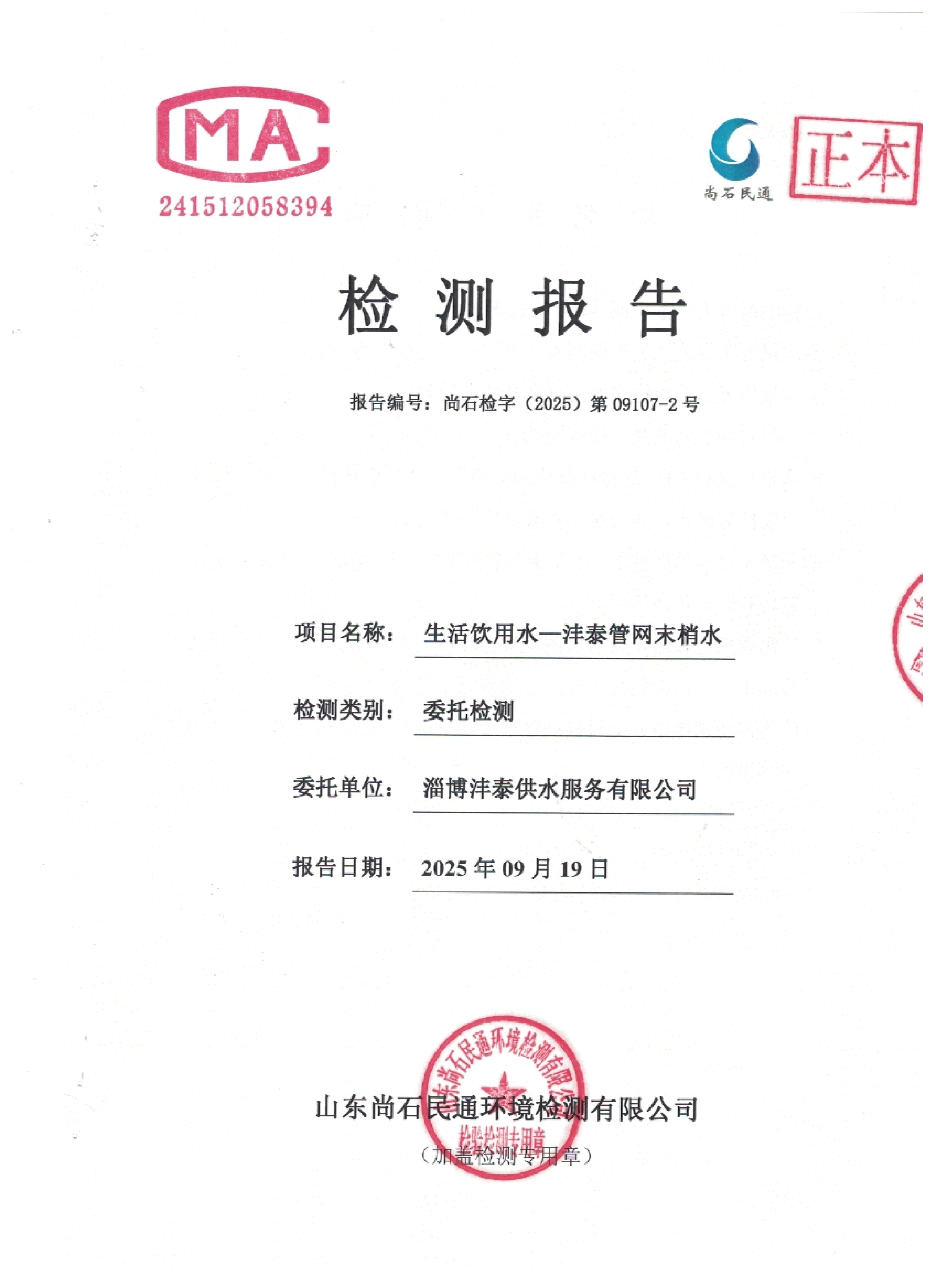 淄博灃泰供水服務有限公司末梢水月檢報告