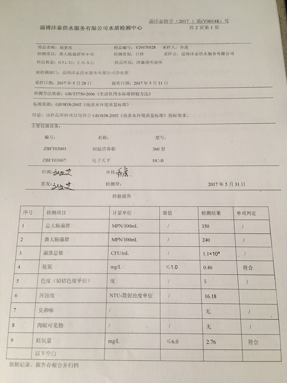 淄博灃泰供水服務(wù)有限公司地表水檢測(cè)日?qǐng)?bào)表