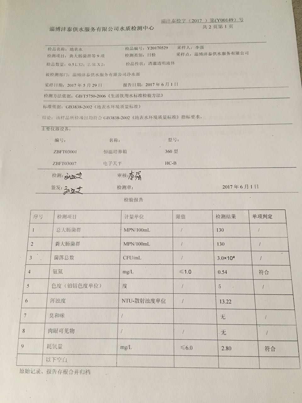 淄博灃泰供水服務(wù)有限公司地表水檢測(cè)日?qǐng)?bào)表