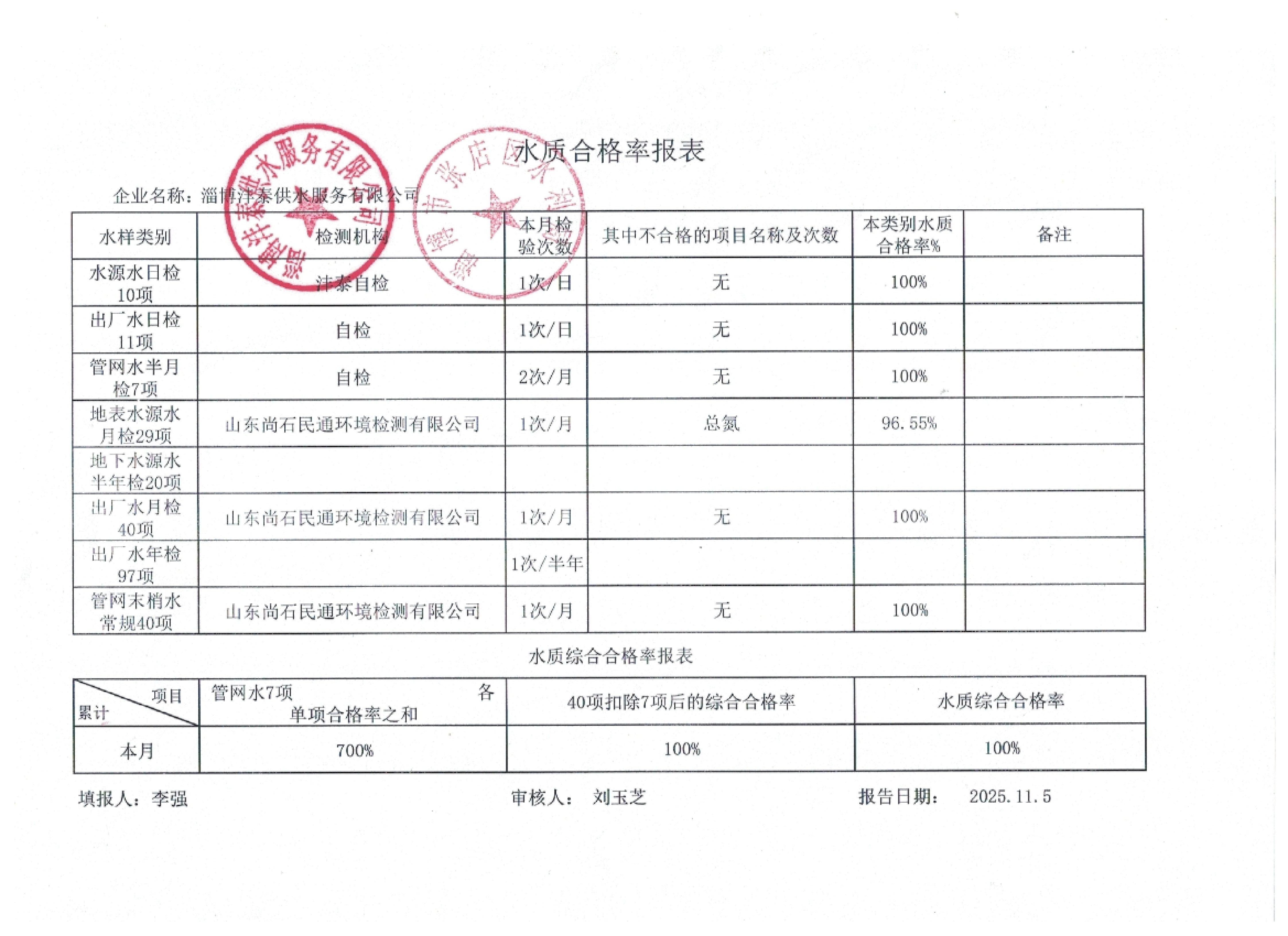 淄博灃泰供水服務有限公司水質合格率報表