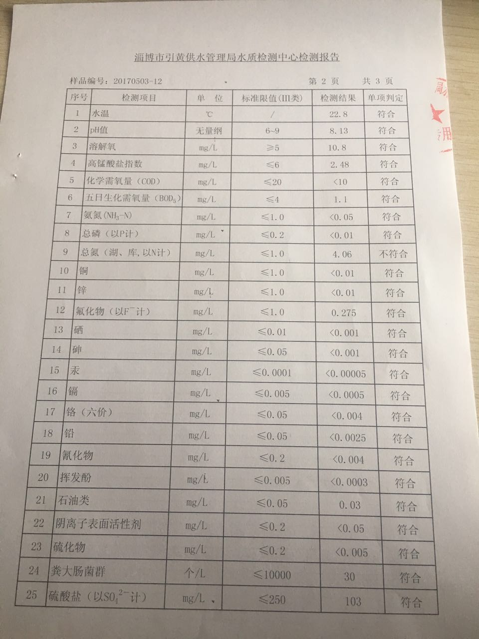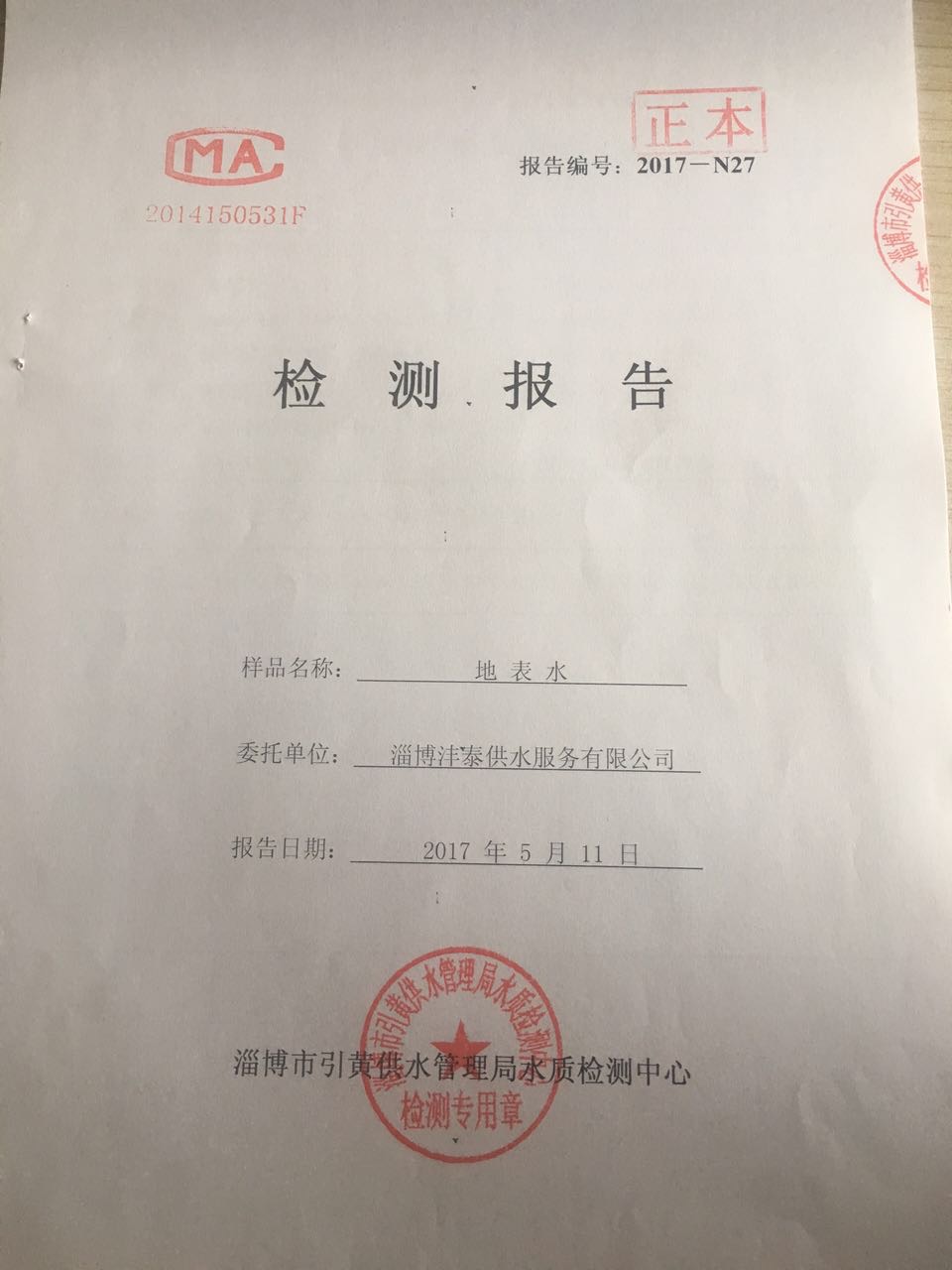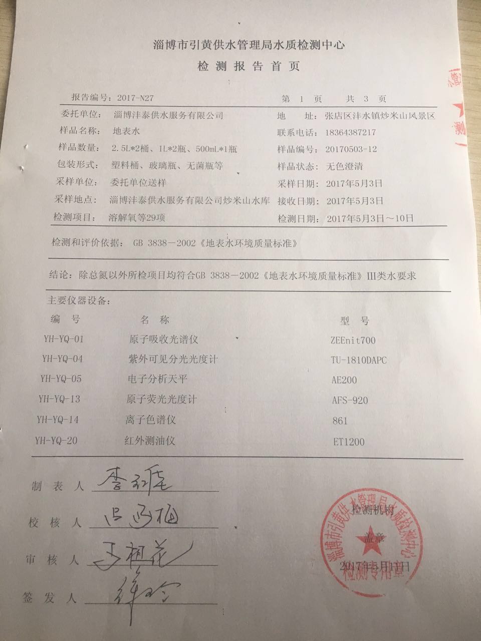 淄博灃泰供水服務(wù)有限公司地表水檢測月報表