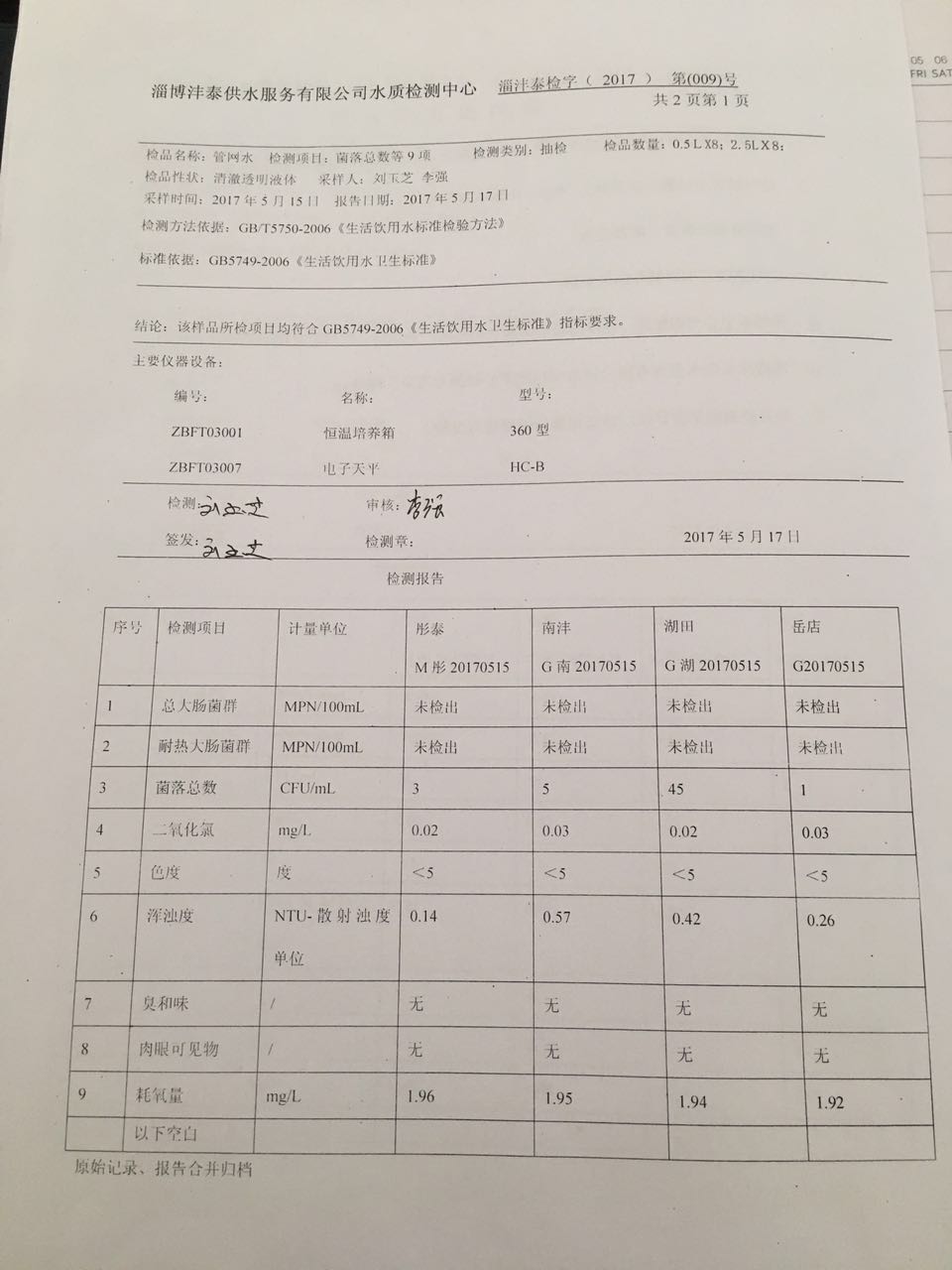 淄博灃泰供水服務(wù)有限公司管網(wǎng)水抽檢報(bào)告