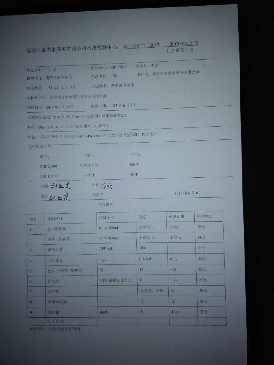 淄博灃泰供水服務(wù)有限公司水質(zhì)檢測日報表