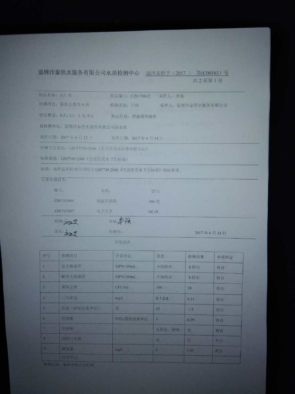 淄博灃泰供水服務(wù)有限公司水質(zhì)檢測日報表