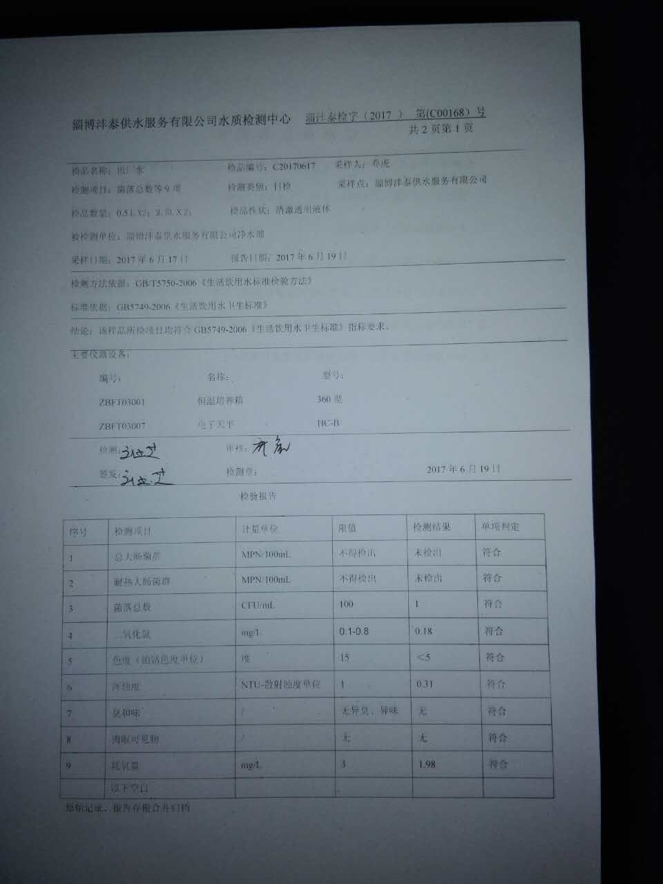 淄博灃泰供水服務(wù)有限公司水質(zhì)檢測日報(bào)表
