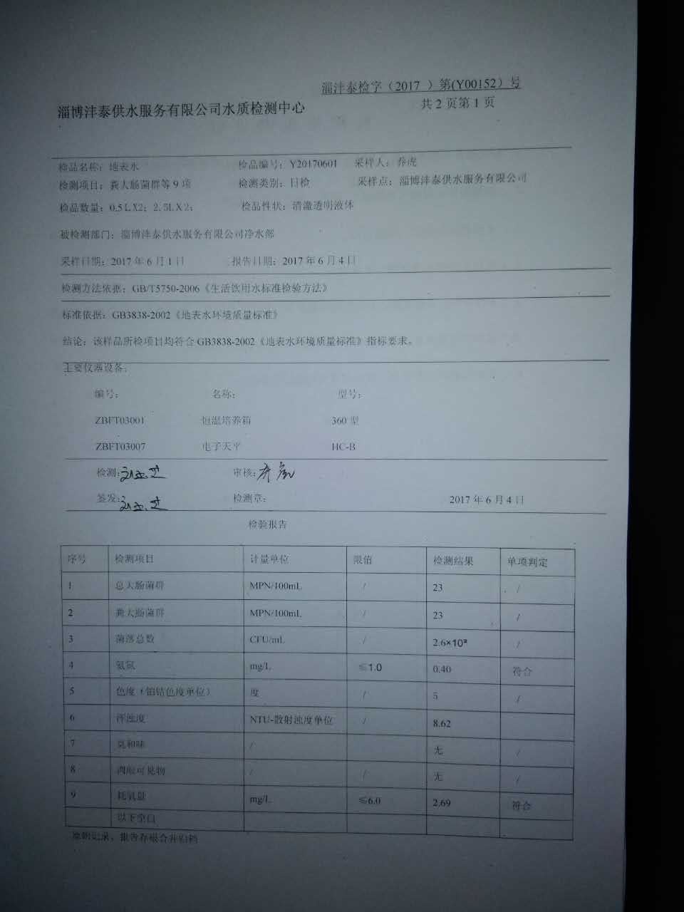淄博灃泰供水服務有限公司地表水檢測日報表