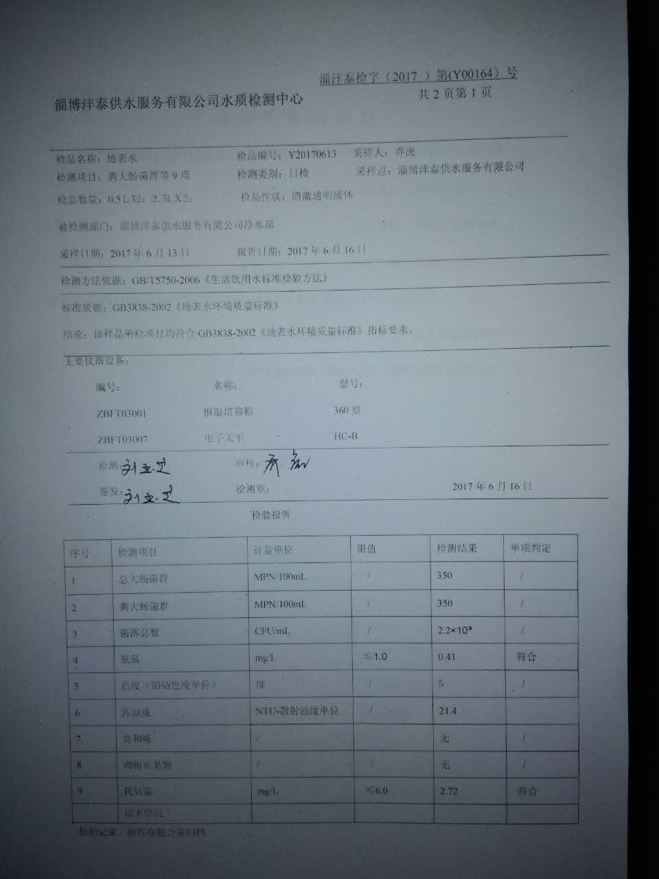 淄博灃泰供水服務(wù)有限公司地表水檢測日報表