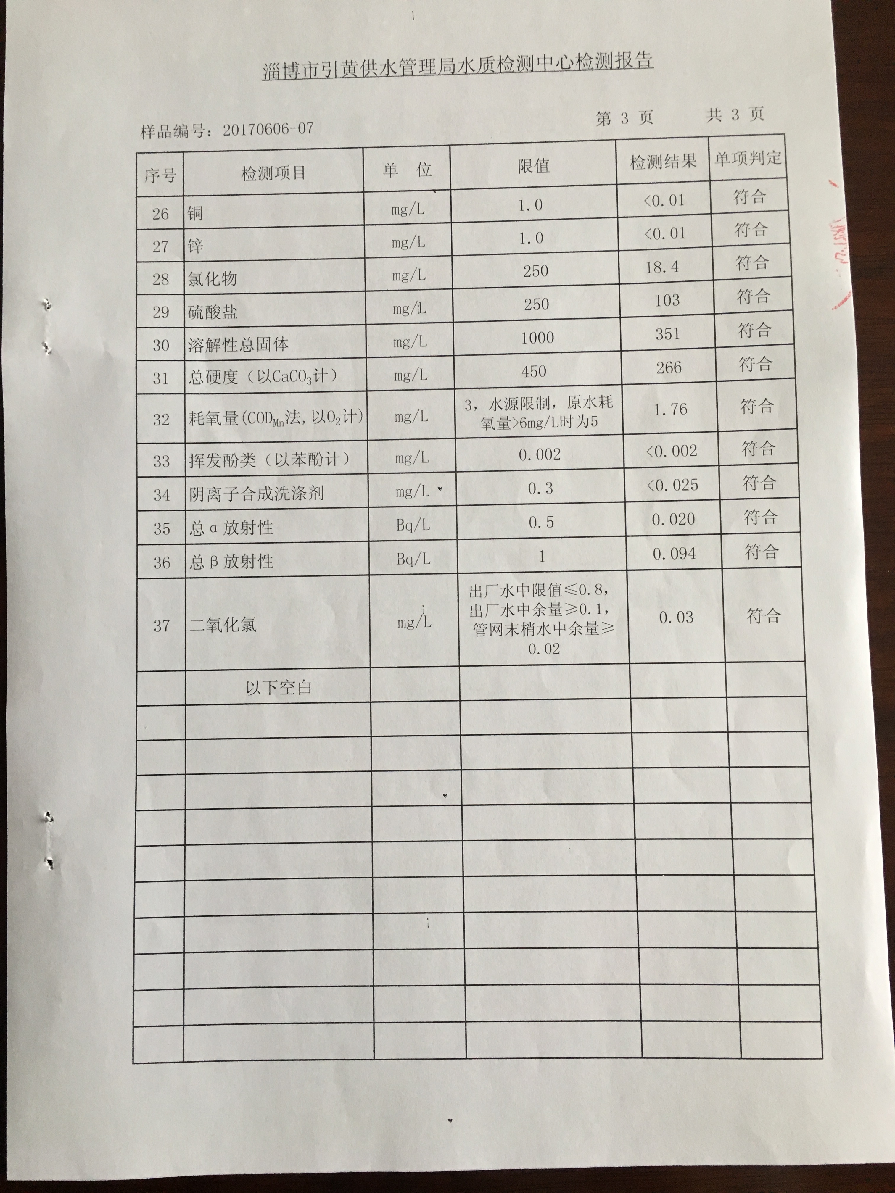 淄博灃泰供水服務有限公司管網(wǎng)水檢測月報表
